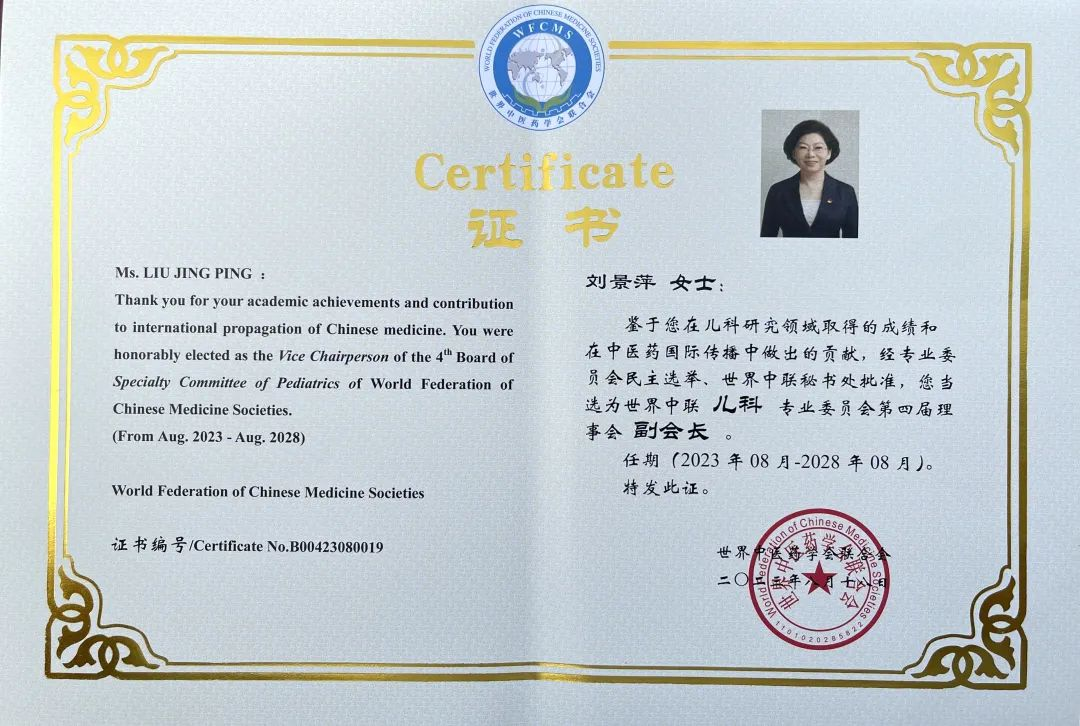 Z6·尊龙时凯药业集团党委书记、董事长刘景萍当选世界中医药学会联合会儿科专业委员会第四届理事会副会长
